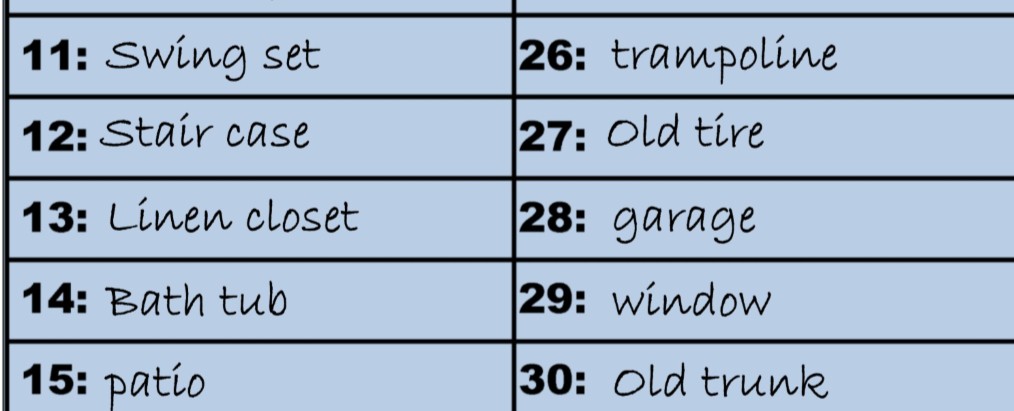 The answer to each clue is numerical. One the players determine the correct answer they look on the clue locator sheet (included in download) and next to that number they will see where they need to look for the next clue. You will fill this sheet out before the hunt, you will fill out 10 hiding spot that you use to hide the clues and fill the remaining 20 spots on the sheet with decoy answers.