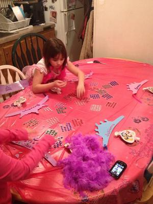 Using foam tiara cut outs and self adhesive gems (both available at local craft stores or online at oriental trading) allow the little girls creative side loose. as a bonus I used glitter glue the day before and wrote each princess' names so it would be dry for them.